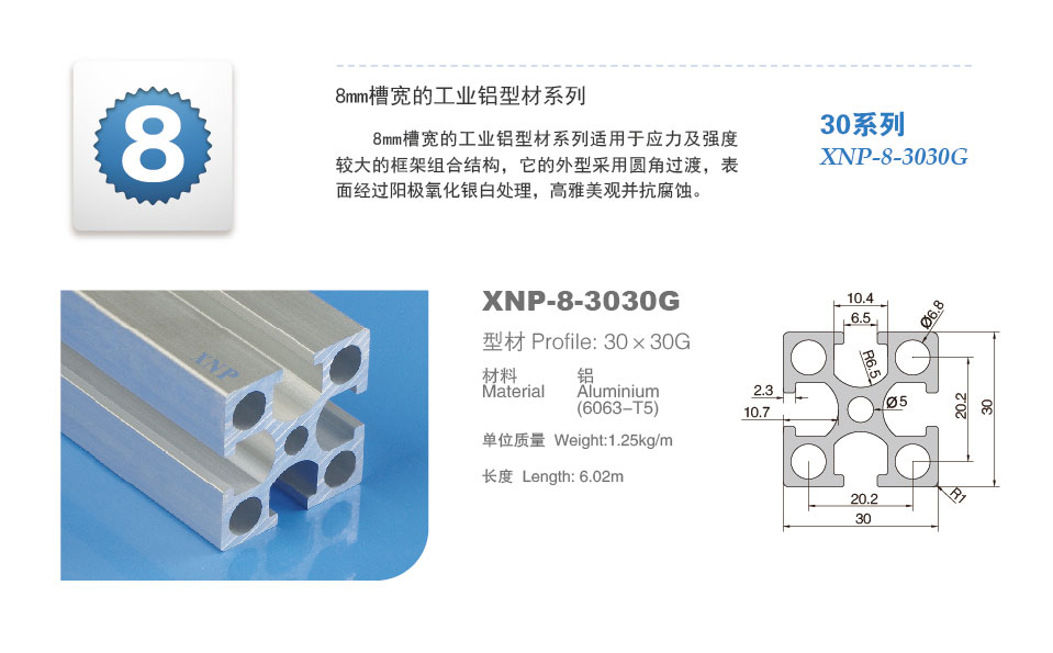 材料:铝合金Material Aluminum(6063-T5)单位质量Weight:1.25kg/m长度Length:6.02m集合惯性 Mass of lnertia:lx:2.85 cm4 ly:2.85 cm4截面惯性 Section modulus:Zx:1.80 cm3 Zy:1.80 cm3